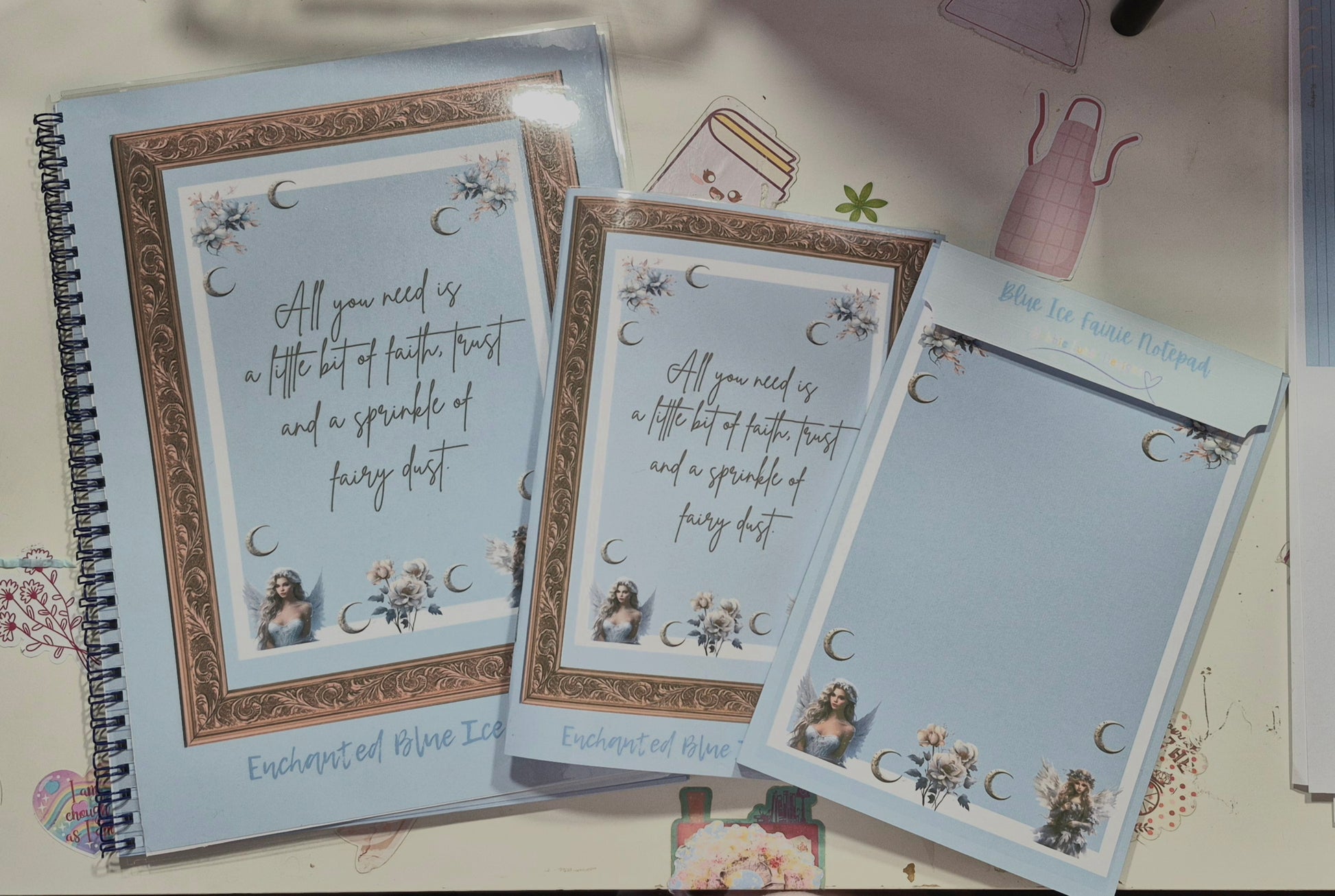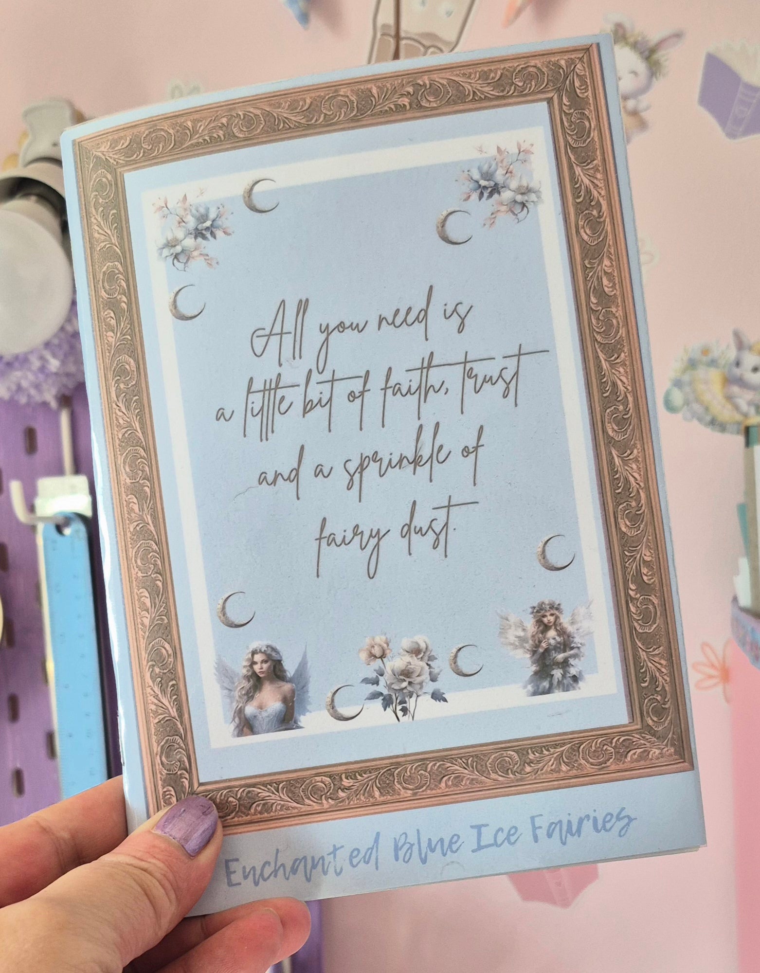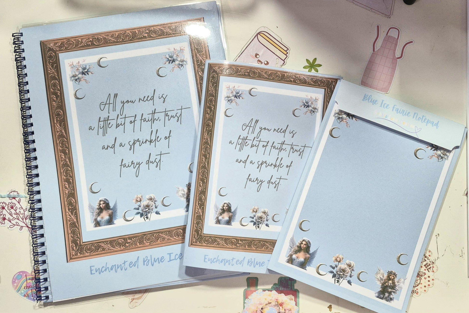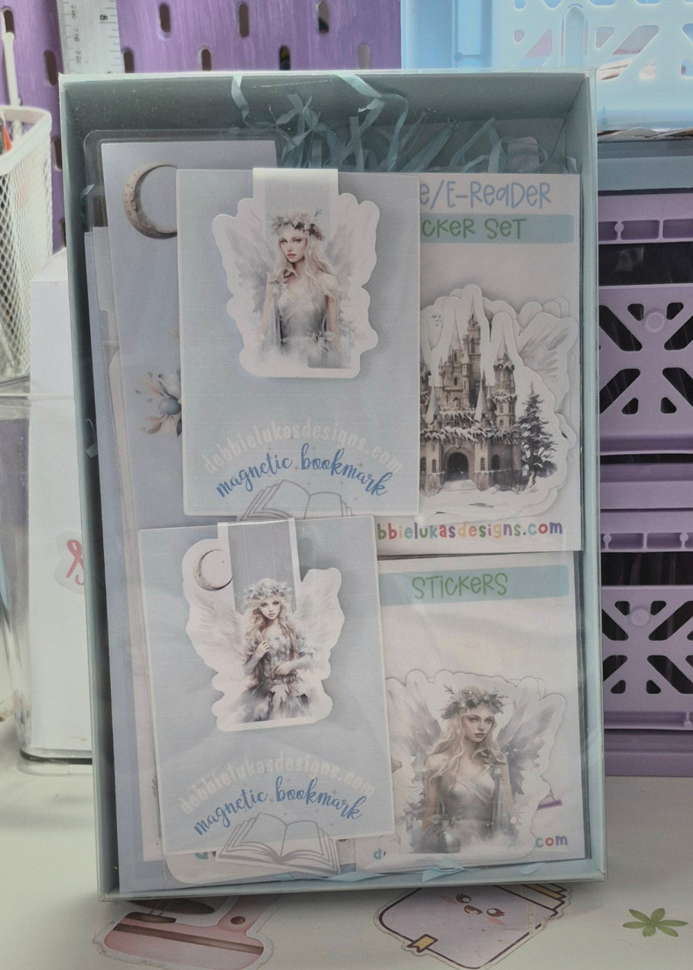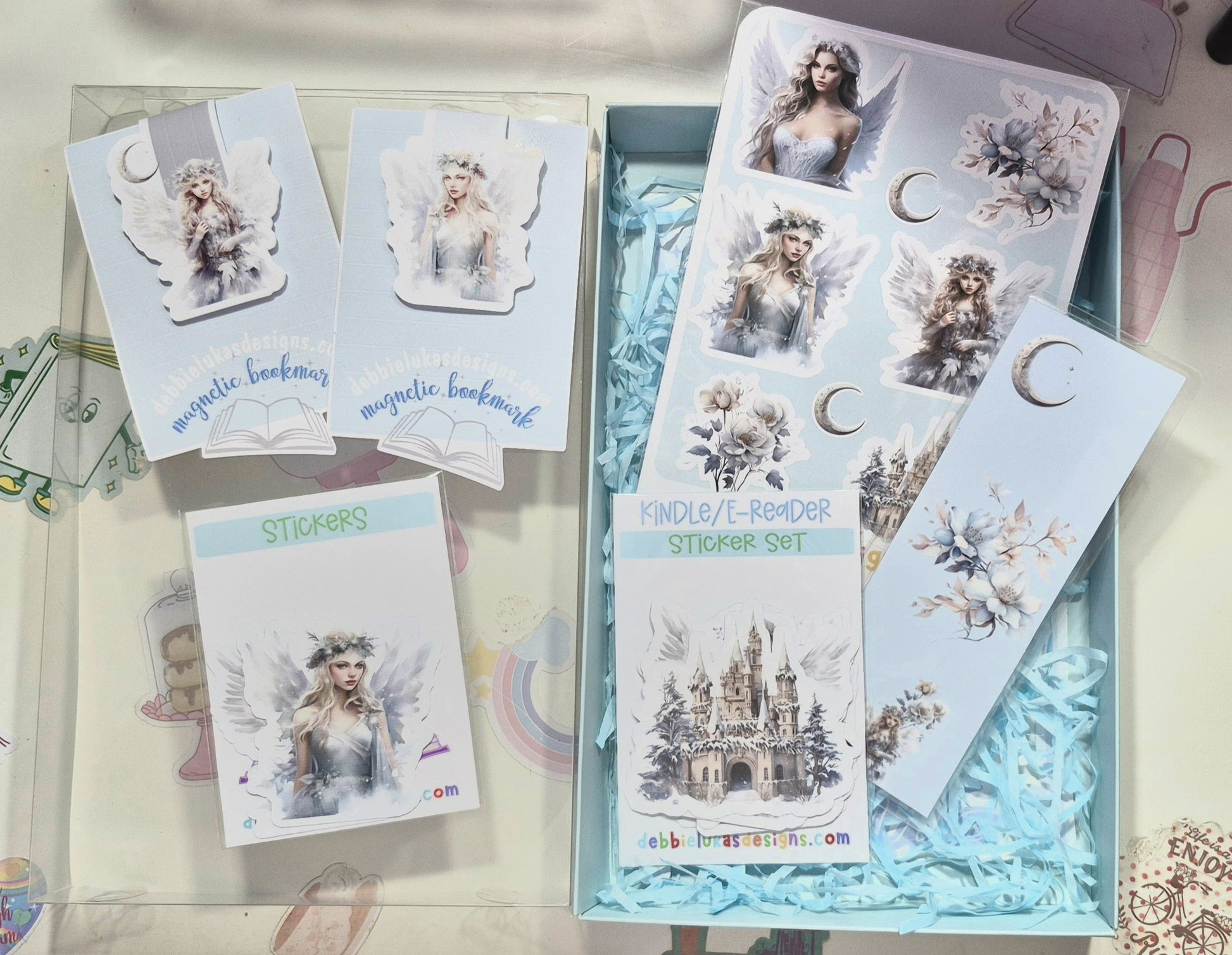 Collection Details: • Coordinated ice blue and silver winter theme • Ethereal fairy designs • Delicate floral motifs • Enchanting crescent moon elements • Magical castle artwork • Professional laminated finishes • Perfect for both physical and digital reading accessories